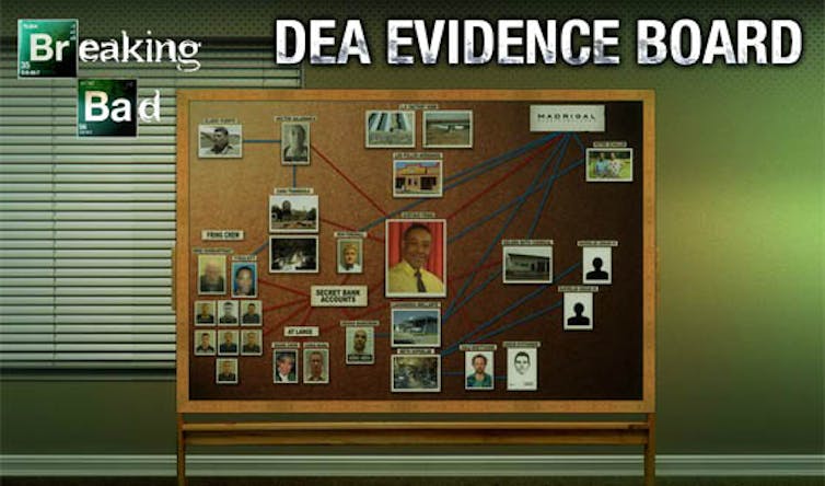 En el cuarto capítulo de la quinta temporada de Breaking Bad, el agente de la DEA Hank Schrader observa un tablón de corcho con las fotos de los miembros de la organización que controla la venta de drogas en Albuquerque. Los cordeles rojos conectan los criminales con relación conocida; los hilos azules, las posibles vinculaciones aún sin confirmar. Hank sospecha que a este grafo le faltan vértices y aristas, sobre todo ahora que la metanfetamina azul ha vuelto a las calles.
