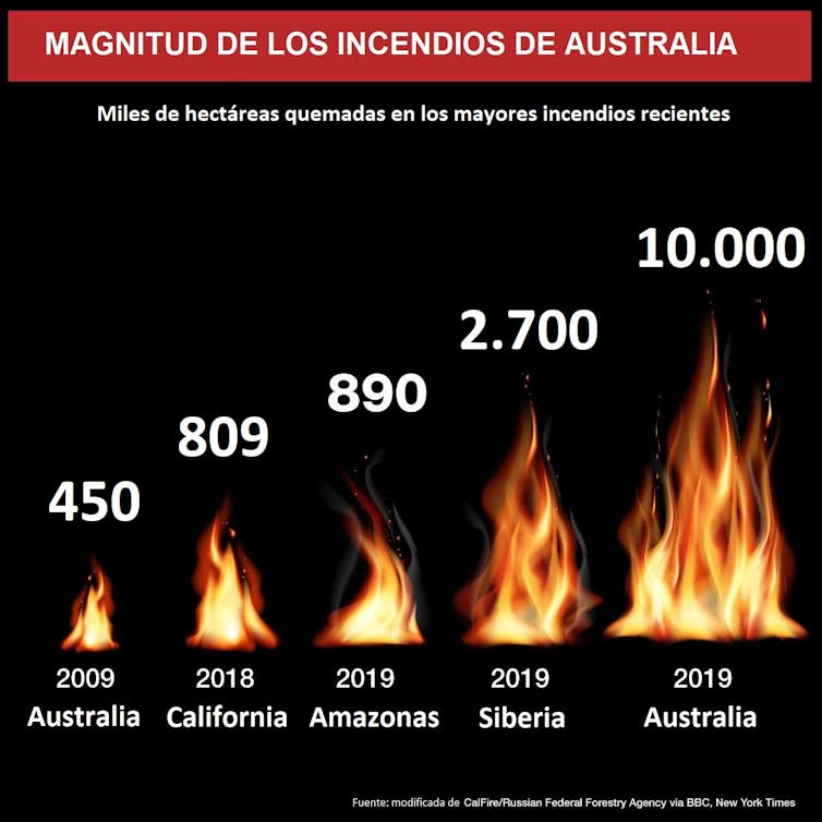 Las condiciones cálidas y secas que han alimentado los incendios no son nada nuevo en Australia, pero, como puede verse en la gráfica, esta temporada de incendios ha sido con diferencia la más calamitosa. En otro artículo publicado en The Conversation ya se han apuntado algunas de las razones de un desastre que ya predecían los científicos australianos cuando calculaban los efectos de un cambio climático, ya convertido en emergencia.