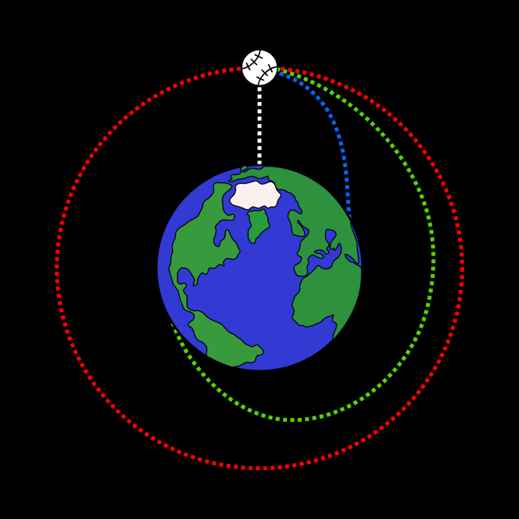 La realidad es muy diferente a la creencia popular de la gravedad cero. Si dejamos caer una pelota desde el espacio (trayectoria blanca en la imagen que sigue a este párrafo), lo hará verticalmente, en caída libre. Si le damos un poco de velocidad horizontal (trayectoria azul), volverá a entrar en caída libre, pero aterrizará en un punto diferente del planeta. Si la lanzamos más rápido (trayectoria verde) llegará más lejos. Y si la lanzamos con la suficiente velocidad, nunca llegará a tocar el suelo porque la pelota entrará en órbita.