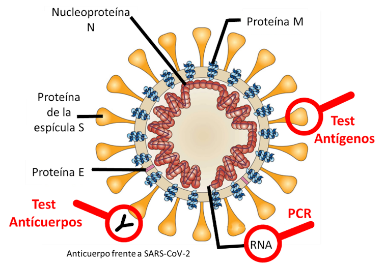 Esquema del coronavirus y las diferentes partes que pueden ser detectadas mediante PCR o Test de antígenos. Los anticuerpos que generamos en respuesta a la infección pueden ser detectados mediante Test de anticuerpos.Fuente: Imagen modificada por los autores a partir de