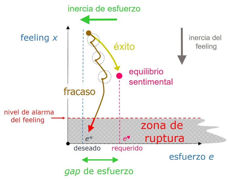 Es decir, el análisis sugiere que las parejas tienen que afrontar un gap o brecha de esfuerzo: independientemente de cuál sea nivel su esfuerzo preferido, el nivel requerido para conseguir una relación de éxito es superior. Además, resulta que la dinámica de esfuerzo no es resiliente, de modo que cuando se relaja el esfuerzo requerido –debido al gap de esfuerzo– la inercia es a relajarlo más, hasta niveles que no consiguen que la relación sea viable con el tiempo.
