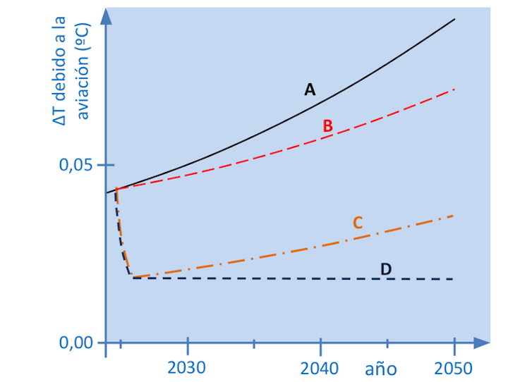 Por tanto, la contribución del sector de la aviación al ritmo de calentamiento global es muy superior al 2,5 % (el porcentaje de las emisiones de dióxido de carbono de la aviación). Además, es una cifra que va a aumentar en el futuro por la expansión que el sector prevé de un 3 % anual.