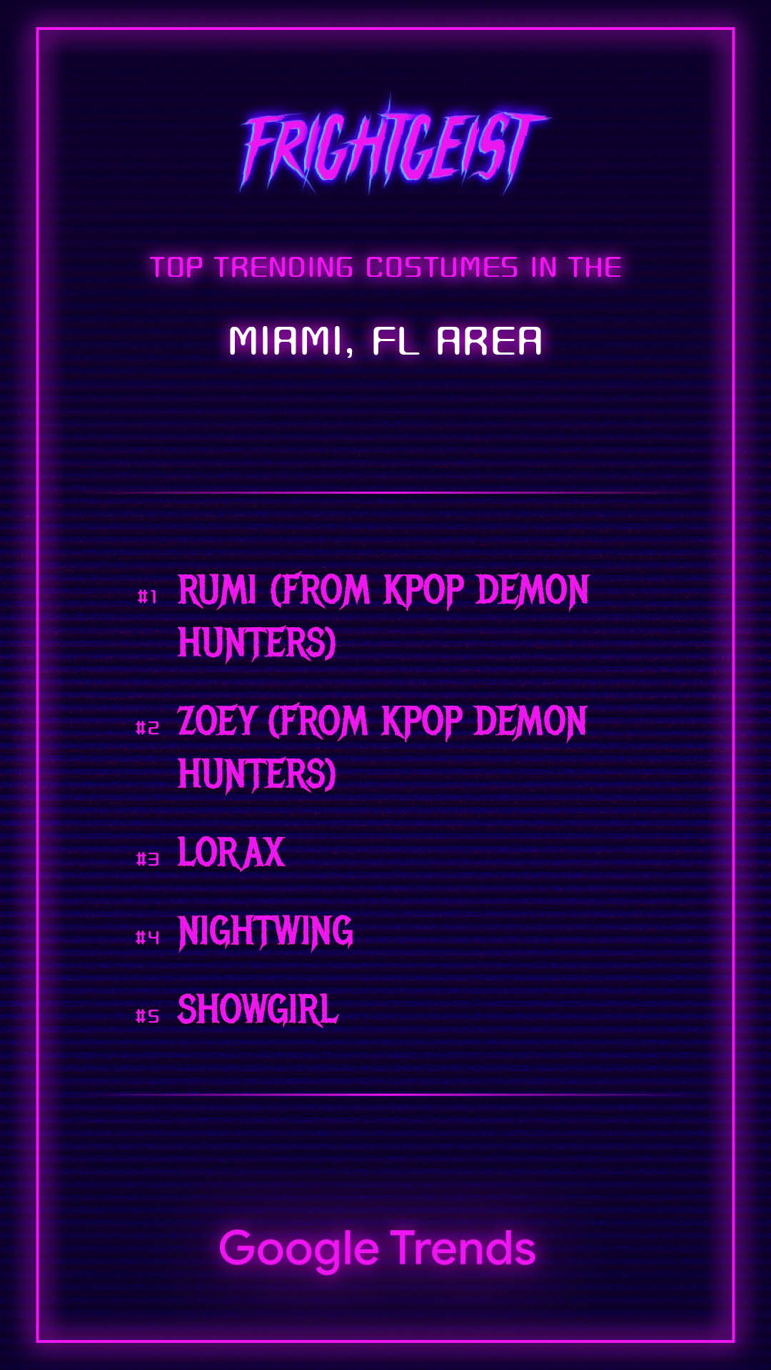En la página web de tendencias de disfraces Frightgeist creada por Google, podemos ver también qué es tendencia por ciudad. Por ejemplo, estas son las de Miami: