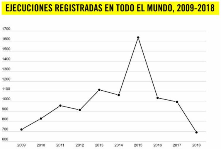 El número de ejecuciones que se llevan a cabo parece seguir asimismo una tendencia descendente: Amnistía Internacional da para el año 2018 una cifra (mínima) de 670 ejecuciones, que representa un descenso notable desde las más de 1 600 confirmadas en 2015, y es el número más bajo de ejecuciones registrado por esta organización en la última década. Por lo que hace al número de condenas a muerte, las registradas en todo el mundo en 2018 (2 531) representan un ligero descenso con respecto a las contabilizadas en 2017 (2 591).