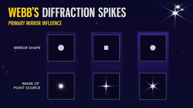 Por ello, las imágenes estelares registradas por su predecesor, el telescopio espacial Hubble (con espejo primario casi circular), presentan imágenes estrelladas de cuatro puntas (teniendo en cuenta su geometría y sus soportes) y no de ocho, como el James Webb.