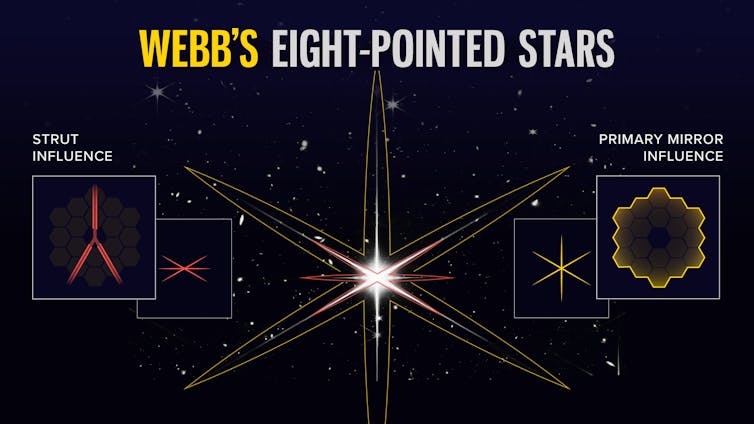 ¿Que ocurre entonces con la imagen estrellada de ocho puntas que registra el James Webb? La clave está en los soportes del espejo primario (struts, en inglés) que también contribuyen a la difracción del telescopio. Como consecuencia, aparecen dos puntas horizontales cruzando las 6 anteriormente citadas.