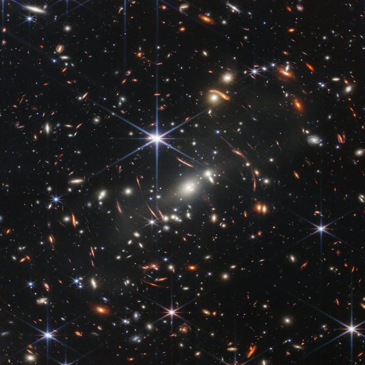 En primer plano observamos las galaxias del cúmulo SMACS 0723, situado a 4 200 millones de años luz. También vemos figuras distorsionadas de galaxias más lejanas (y desconocidas hasta la fecha) justo detrás del cúmulo, cuya luz ha sido desviada por el efecto de lente gravitacional de SMACS 0723.