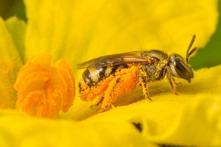 Una abeja con gran cantidad de polen adherido a su cuerpo.Shutterstock / kajornyot wildlife photography