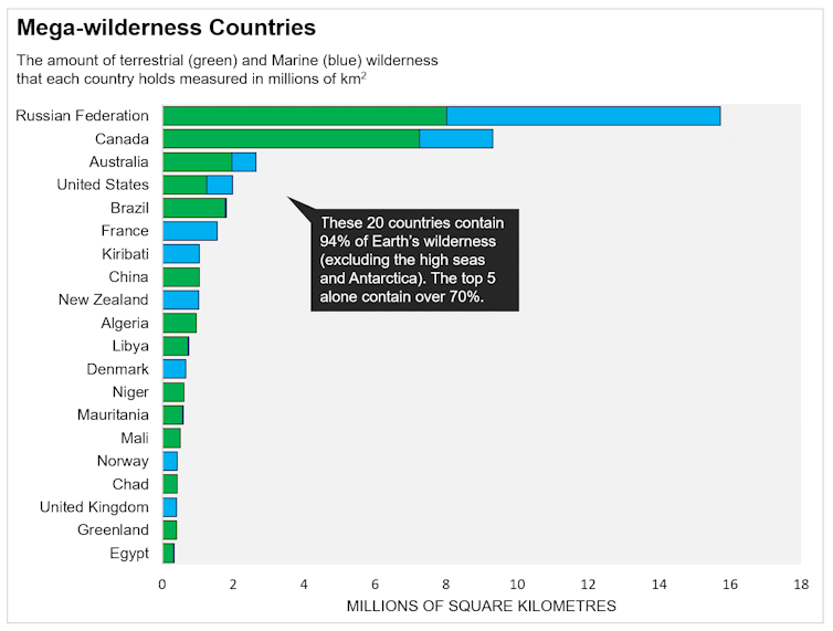 Más del 70% de los espacios naturales se encuentran en tan solo cinco países: Australia, Rusia, Canadá, Estados Unidos (Alaska) y Brasil.